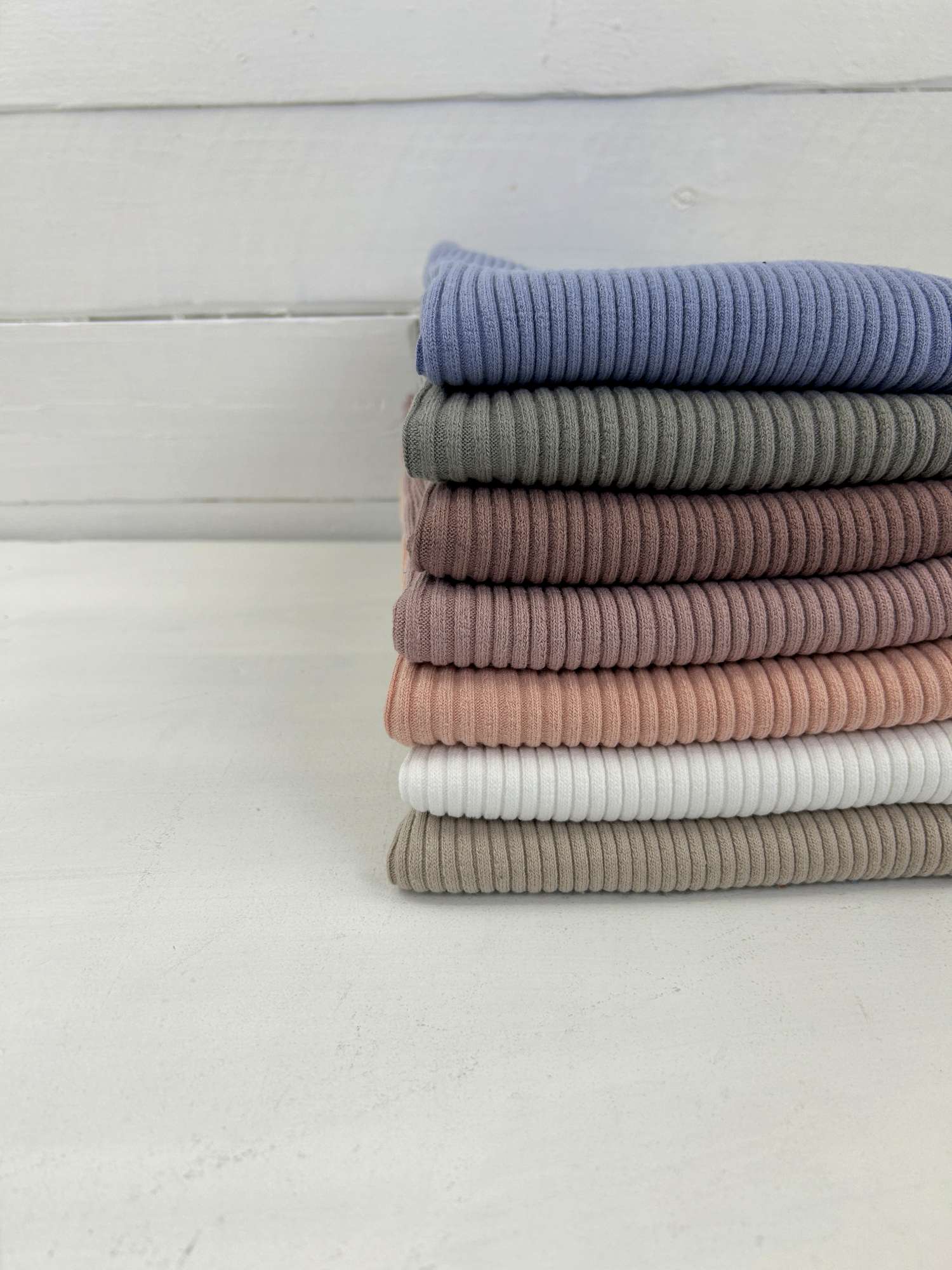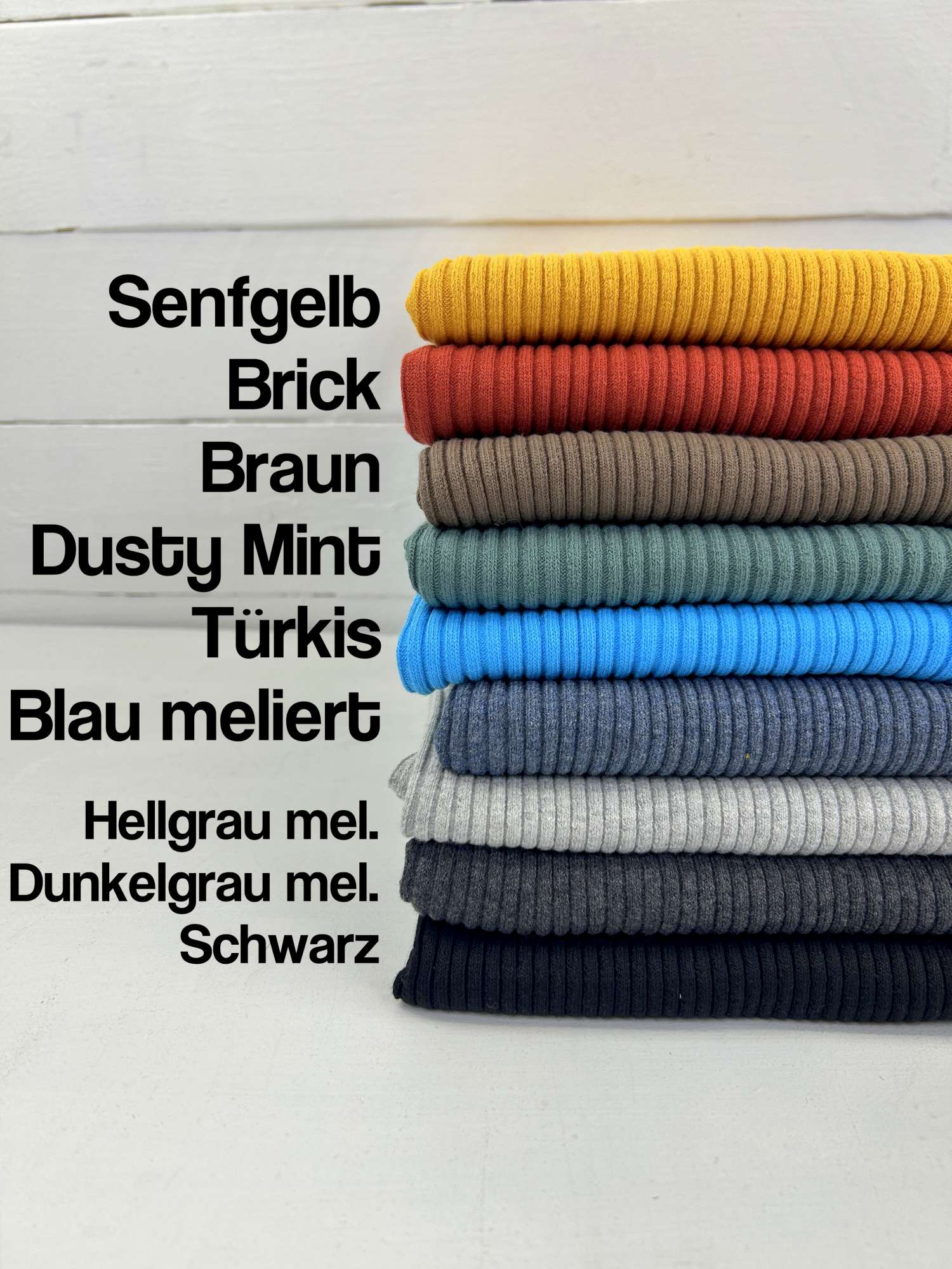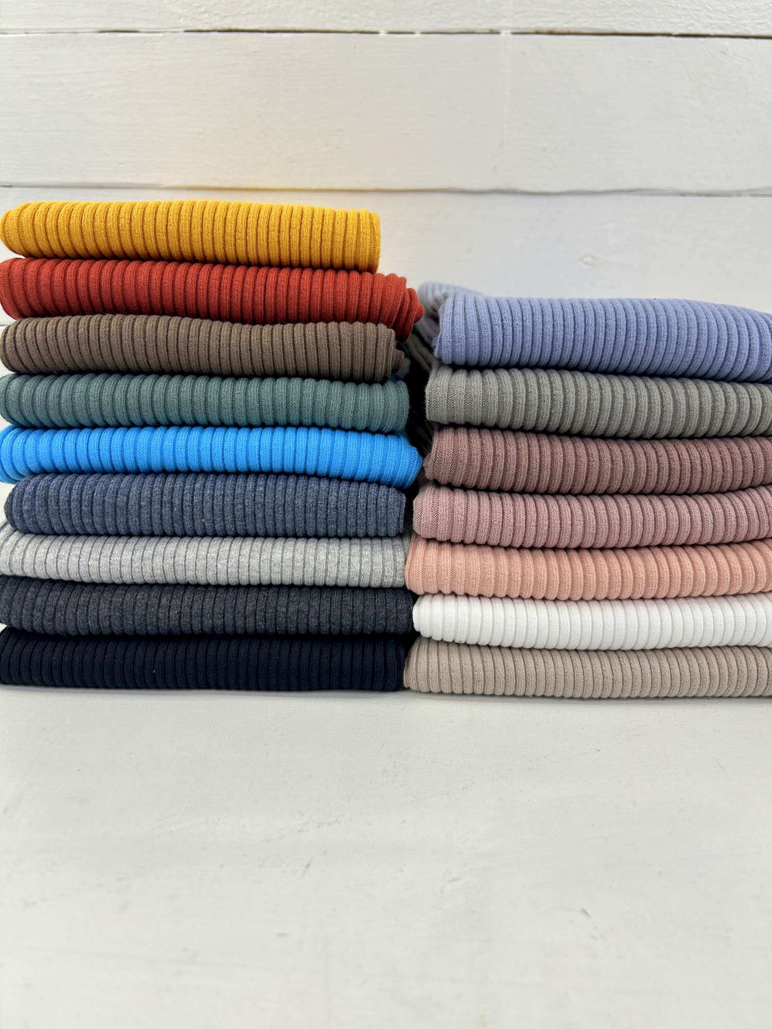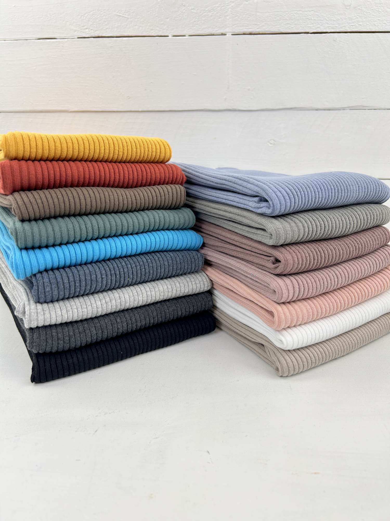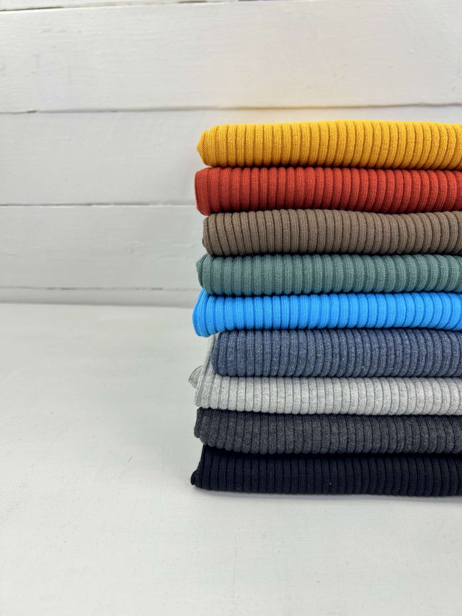 Das hohe Gewicht von ca. 575 g/m² sorgt für Stabilität, ohne dick oder steif zu wirken. Perfekt für Ärmel- und Saumbündchen, Taillenabschlüsse, Leggingsbündchen, Mützen, Krägen und alles, was Halt und Komfort braucht.