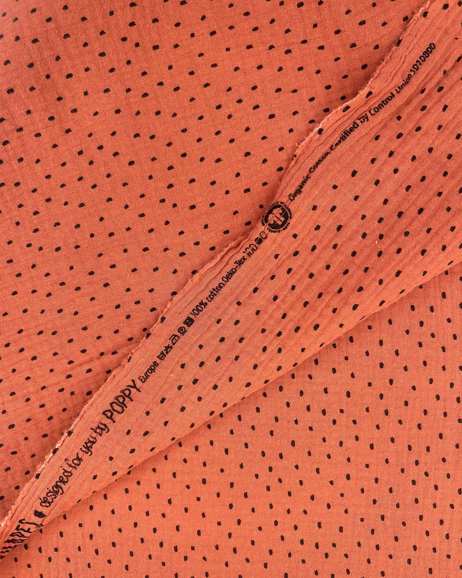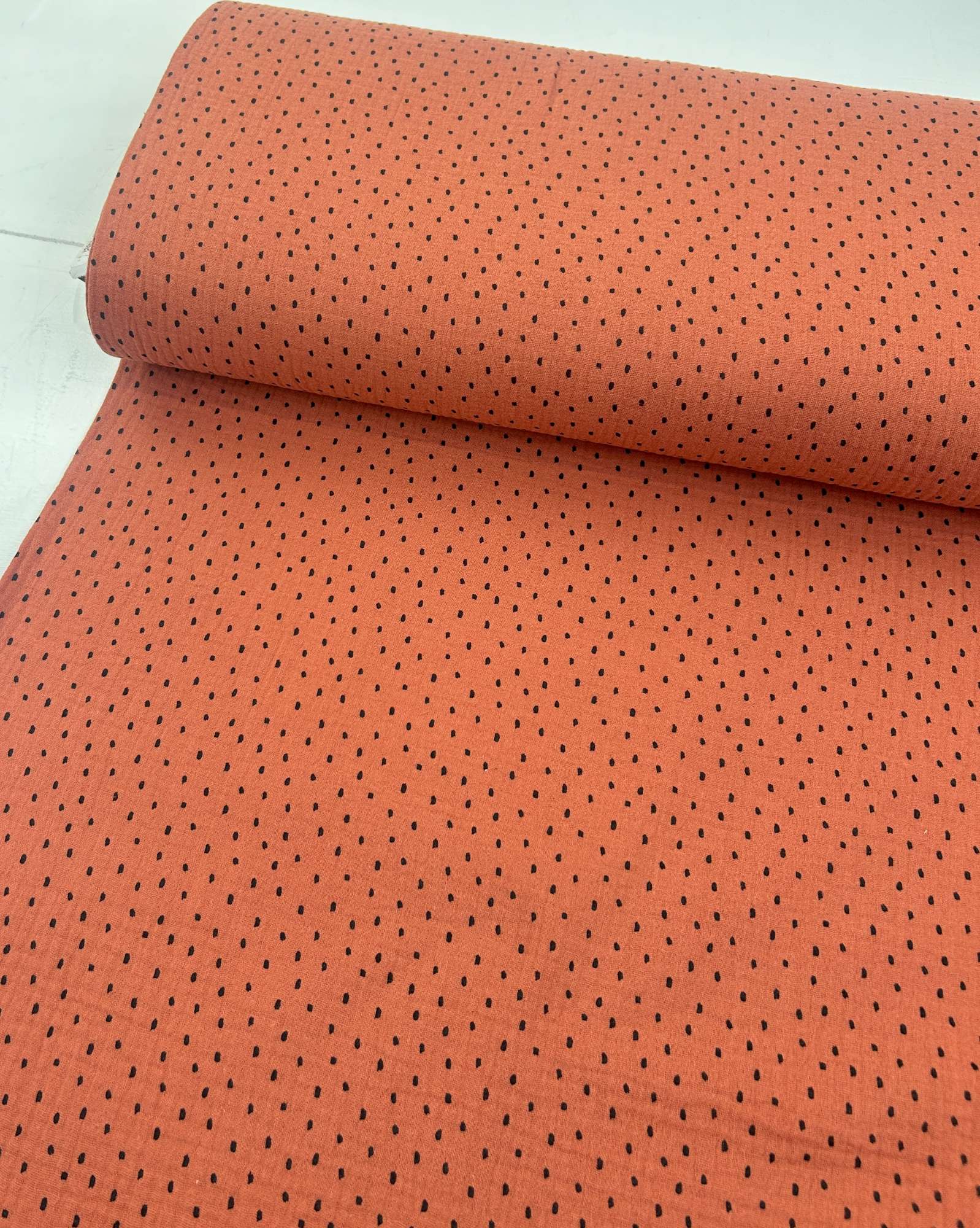 Dieser Musselin Stoff bringt genau das mit, was aktuell gefragt ist: eine warme, trendige Terracotta-Farbe kombiniert mit einem dezenten, unregelmäßigen Punktedesign. Der Look wirkt bewusst ruhig, leicht verspielt, aber nicht kindlich – genau die Mischung, die moderne Nähprojekte hochwertig aussehen lässt.