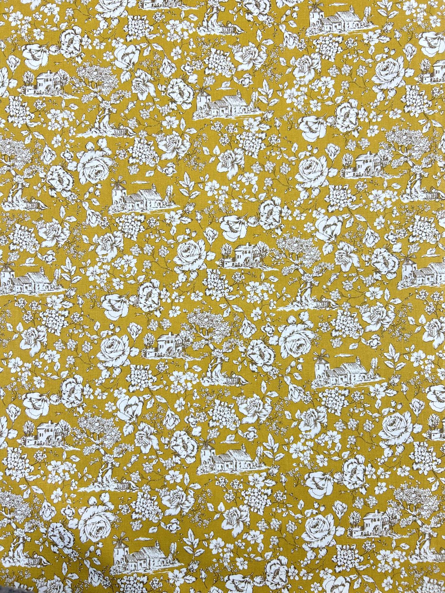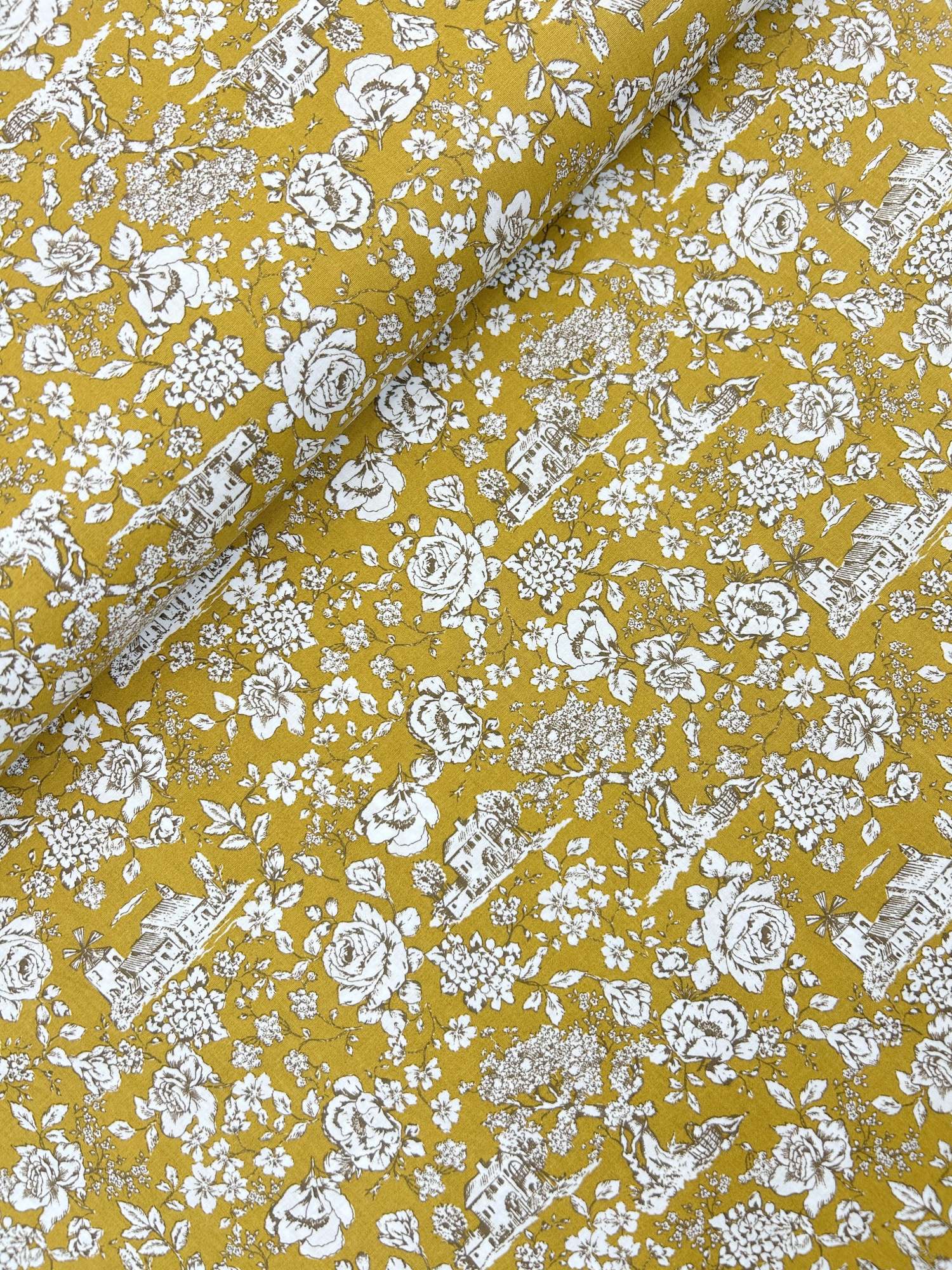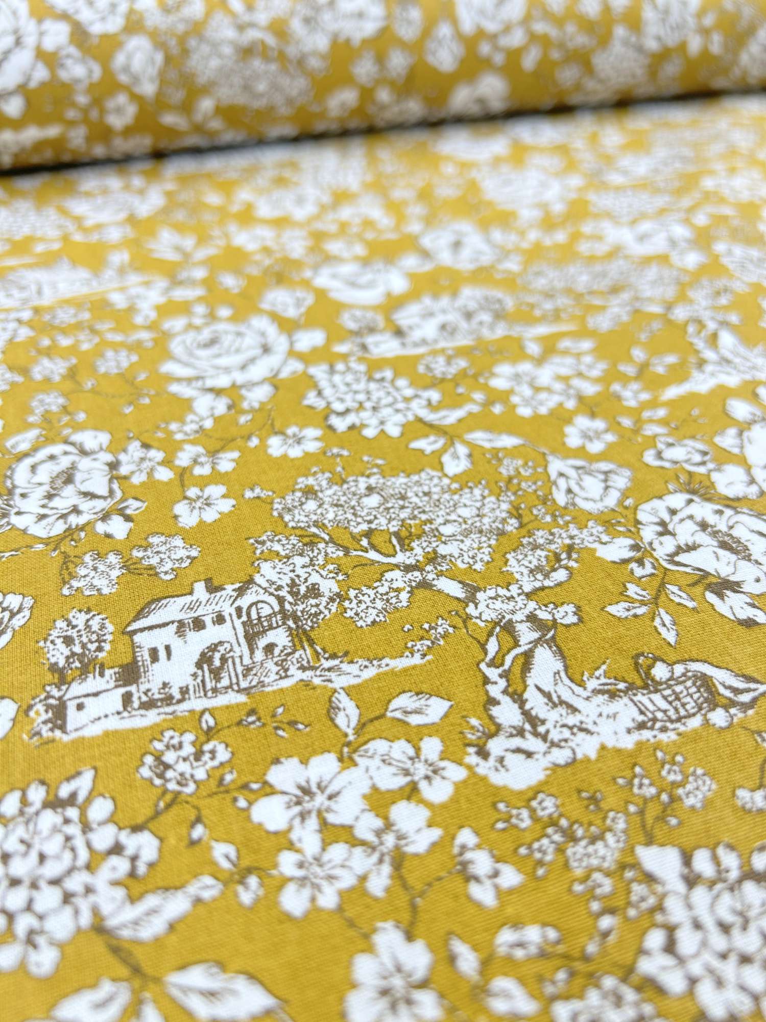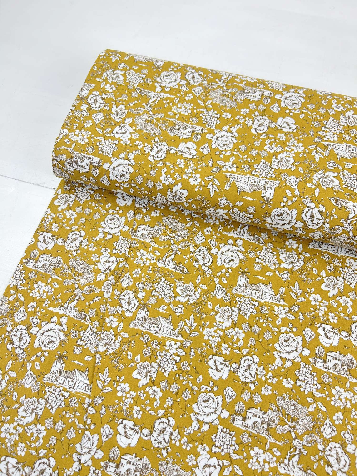 Der Stoff eignet sich für Kleidung wie Blusen, Kleider, Röcke oder locker fallende Tuniken, aber auch für Heimtextilien wie Kissen, Tischläufer, Vorhänge und Taschen. Der ockerfarbene Toile-de-Jouy-Print sorgt für einen klaren, dekorativen Look – ideal, wenn du ein Statement setzen möchtest, ohne dass es aufdringlich wirkt.