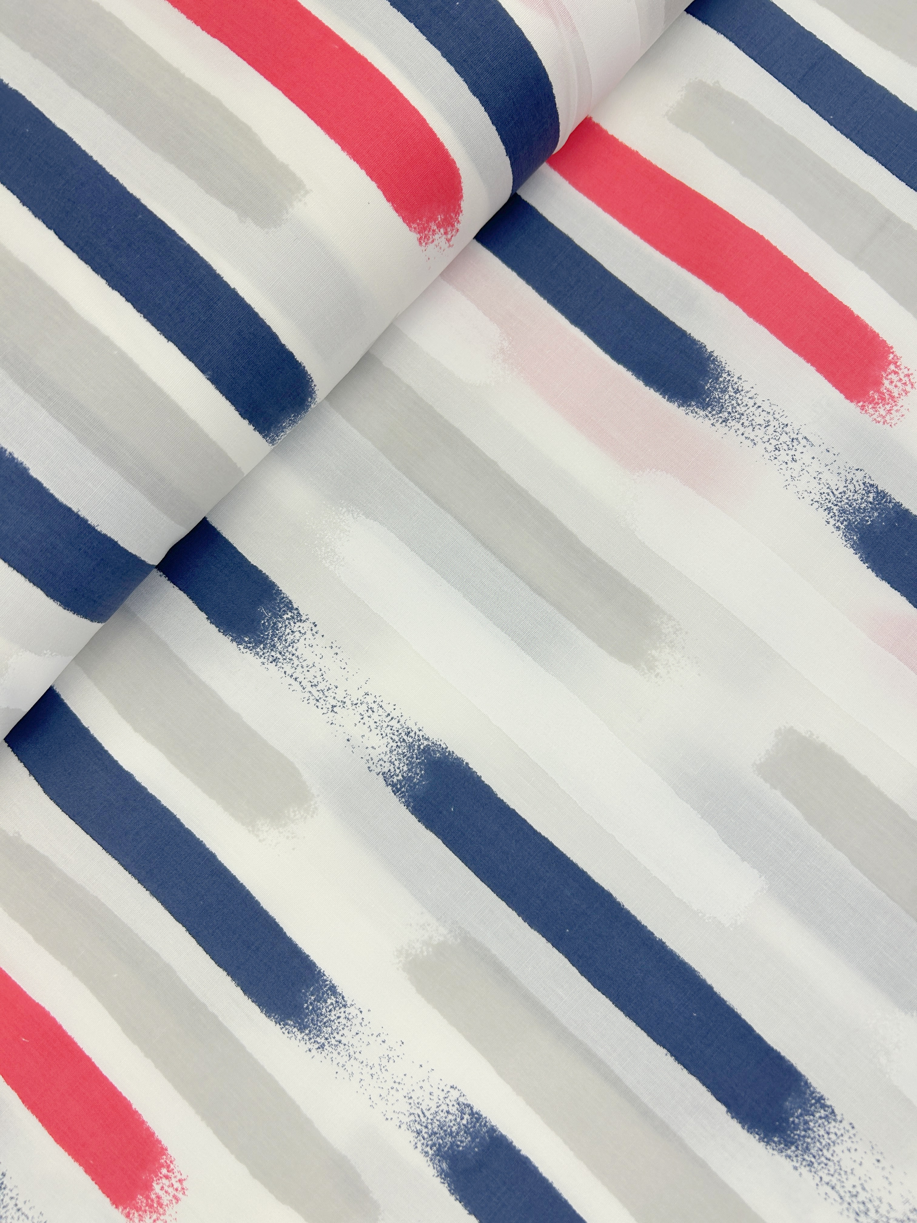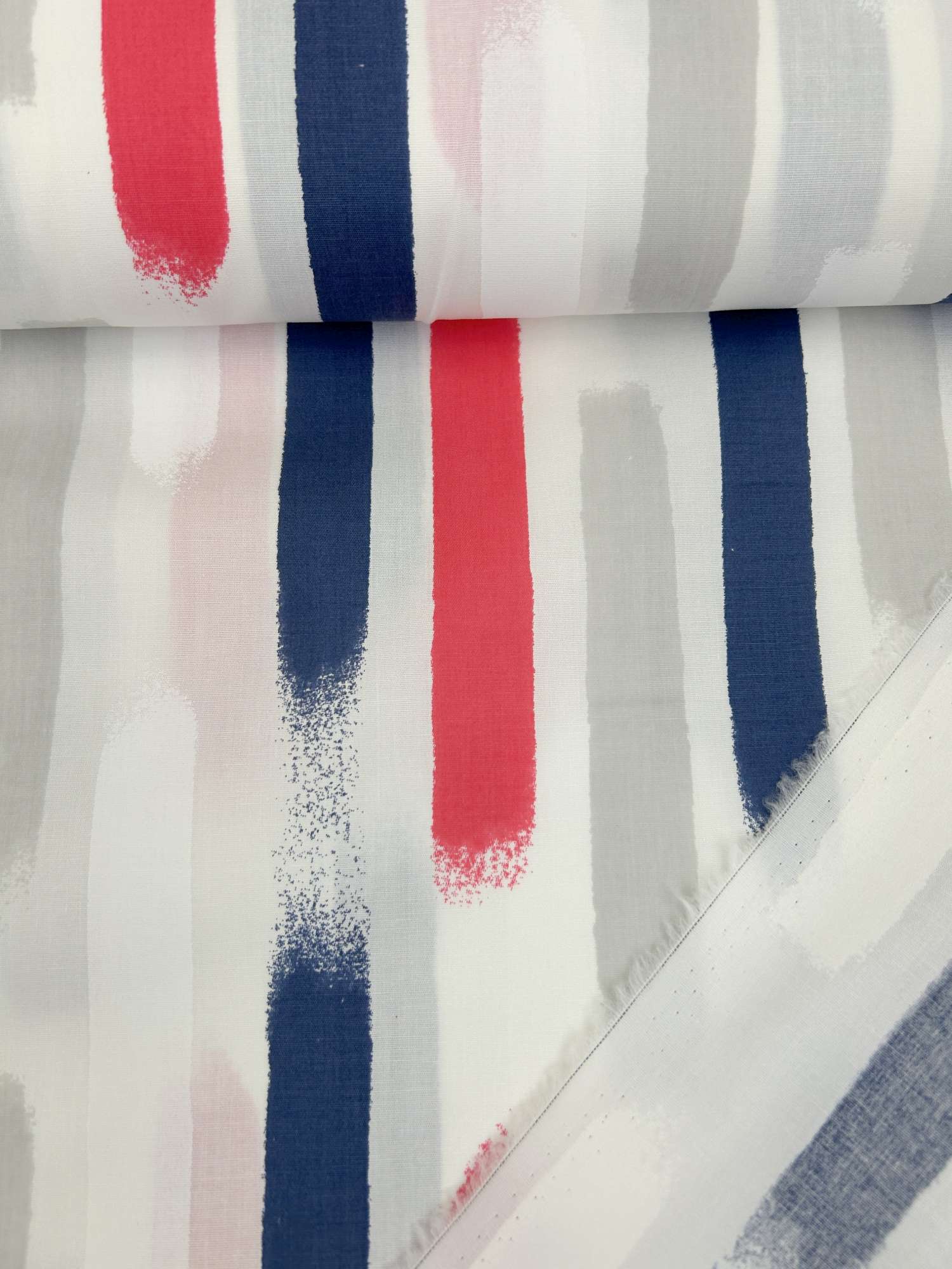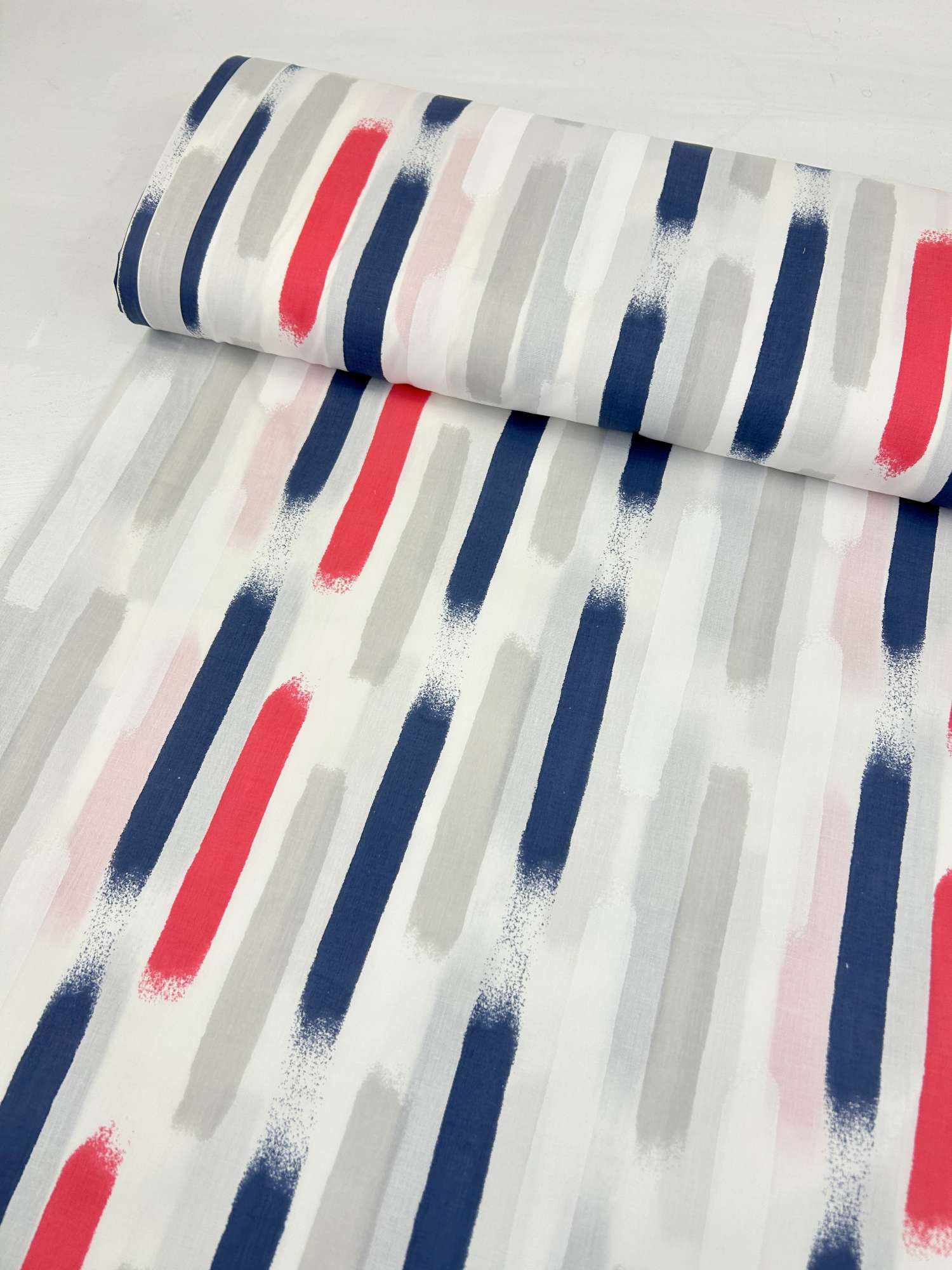 Modern, locker und genau richtig für leichte Sommermode: Diese dehnbare Baumwoll-Webware überzeugt mit einem ruhigen, grafischen Pinselstrich-Design in harmonischen Streifen. Die Kombination aus soften Naturtönen, tiefem Blau und frischen Farbakzenten wirkt modern, aber nicht laut – ideal für zeitlose Kleidung mit besonderem Look.