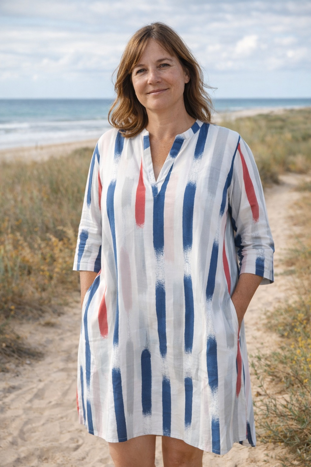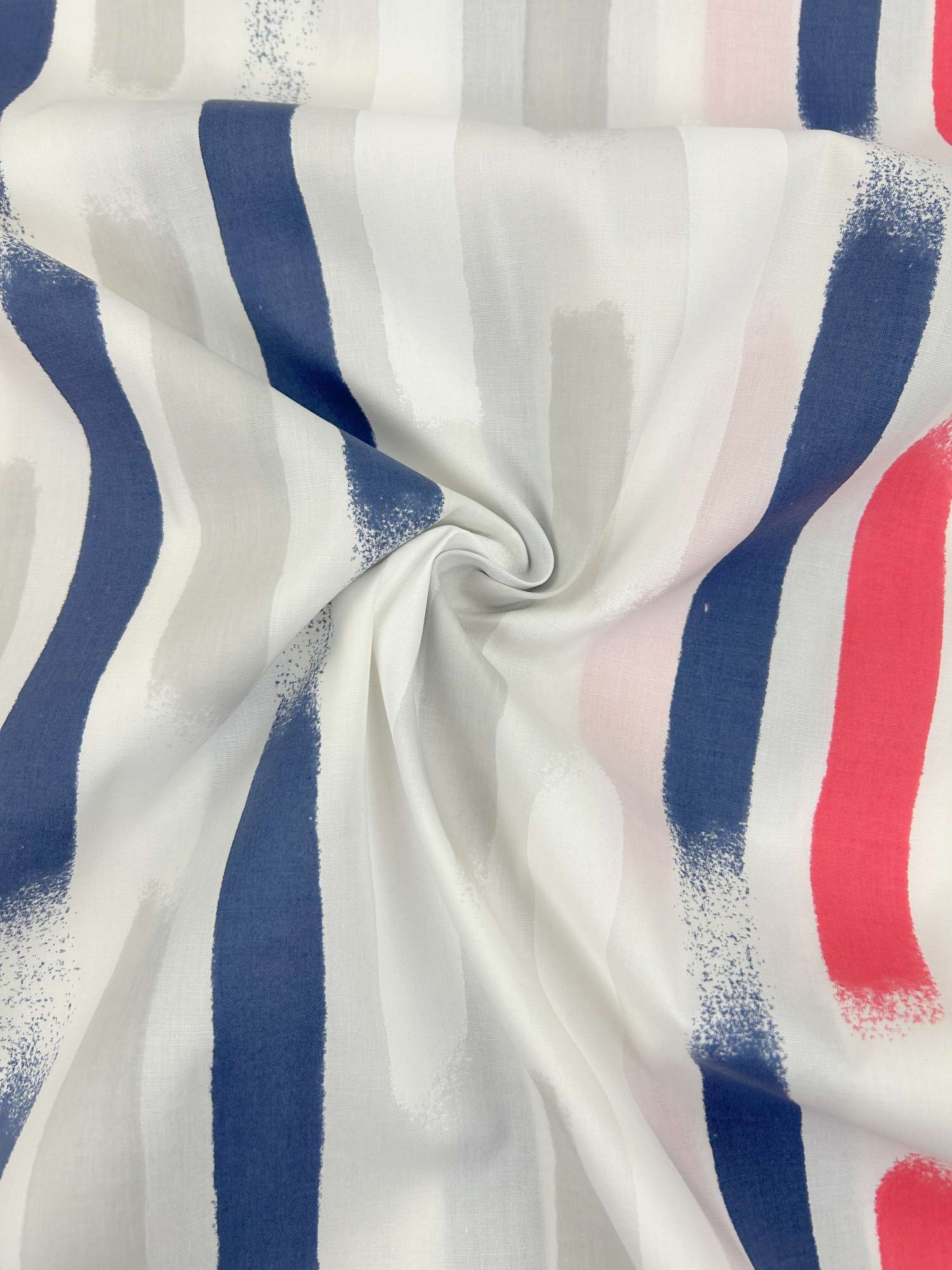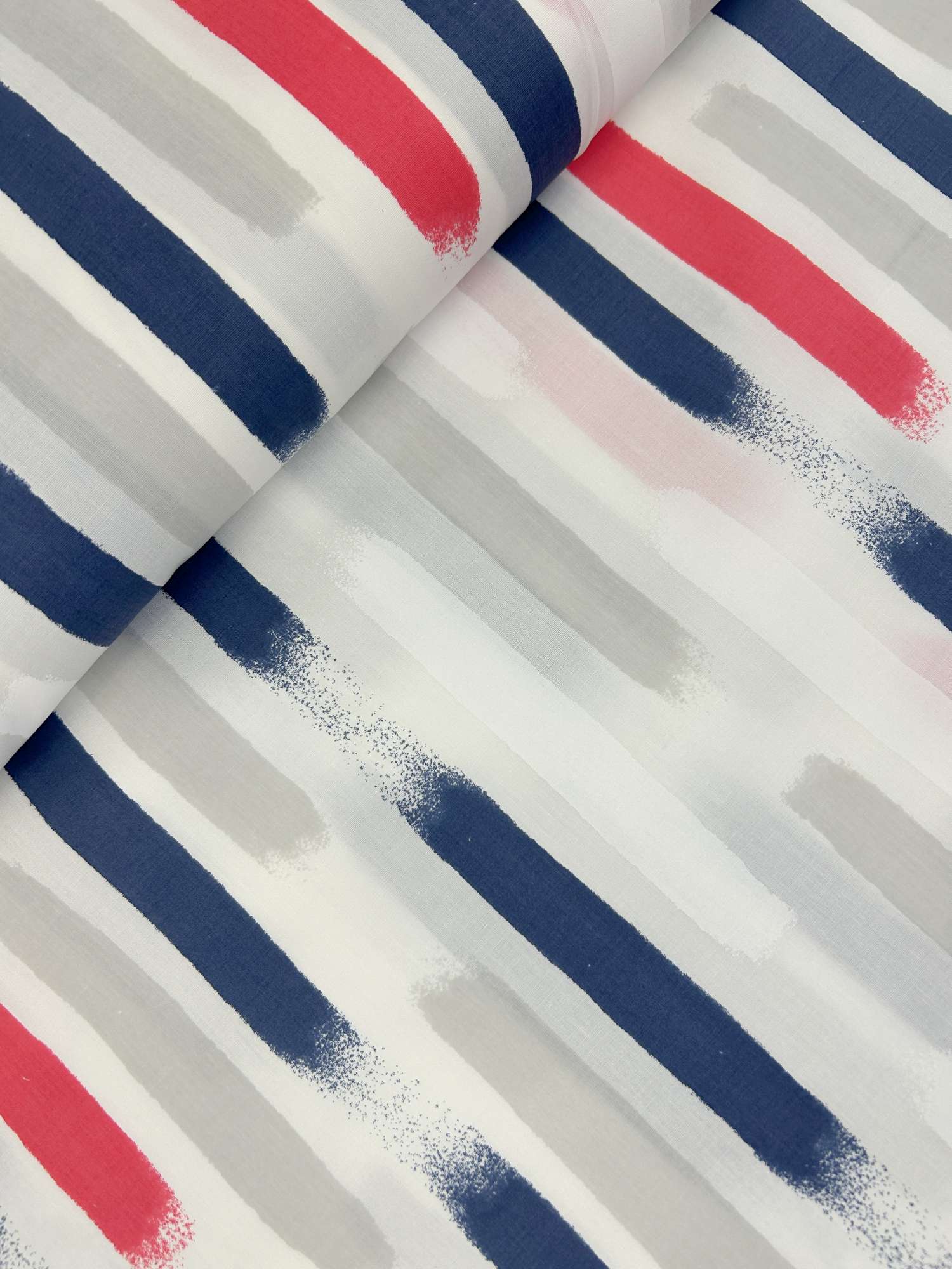 Modern, locker und genau richtig für leichte Sommermode: Diese dehnbare Baumwoll-Webware überzeugt mit einem ruhigen, grafischen Pinselstrich-Design in harmonischen Streifen. Die Kombination aus soften Naturtönen, tiefem Blau und frischen Farbakzenten wirkt modern, aber nicht laut – ideal für zeitlose Kleidung mit besonderem Look.