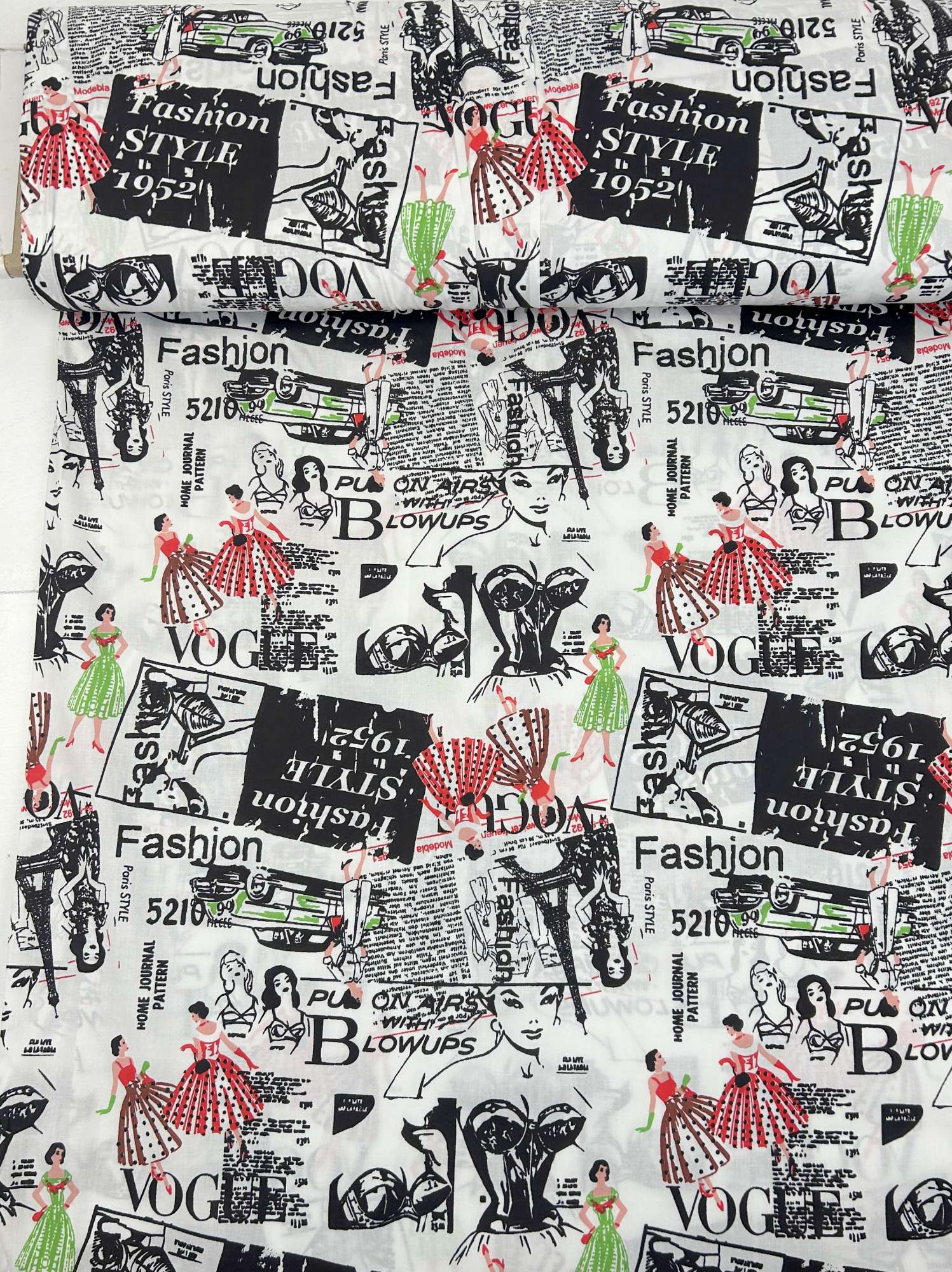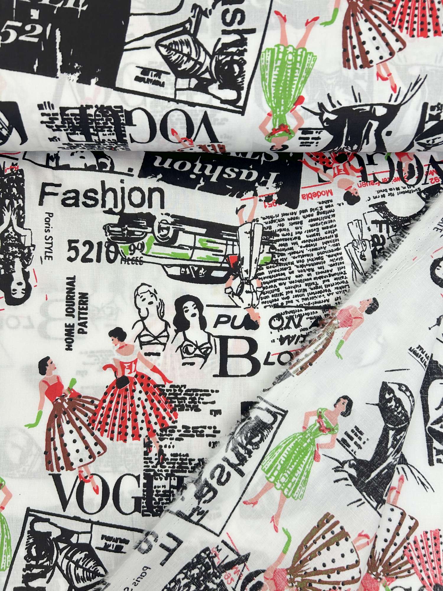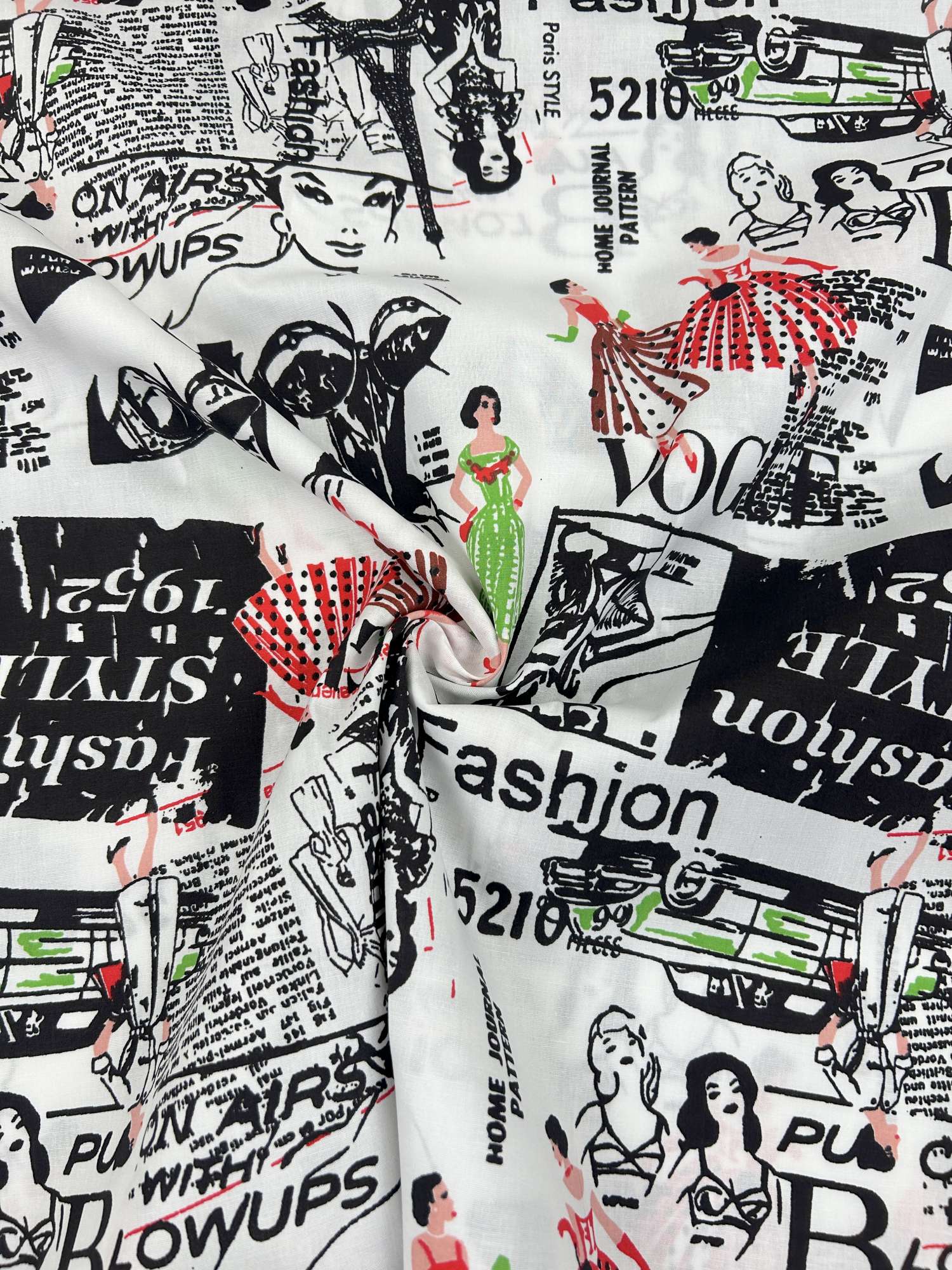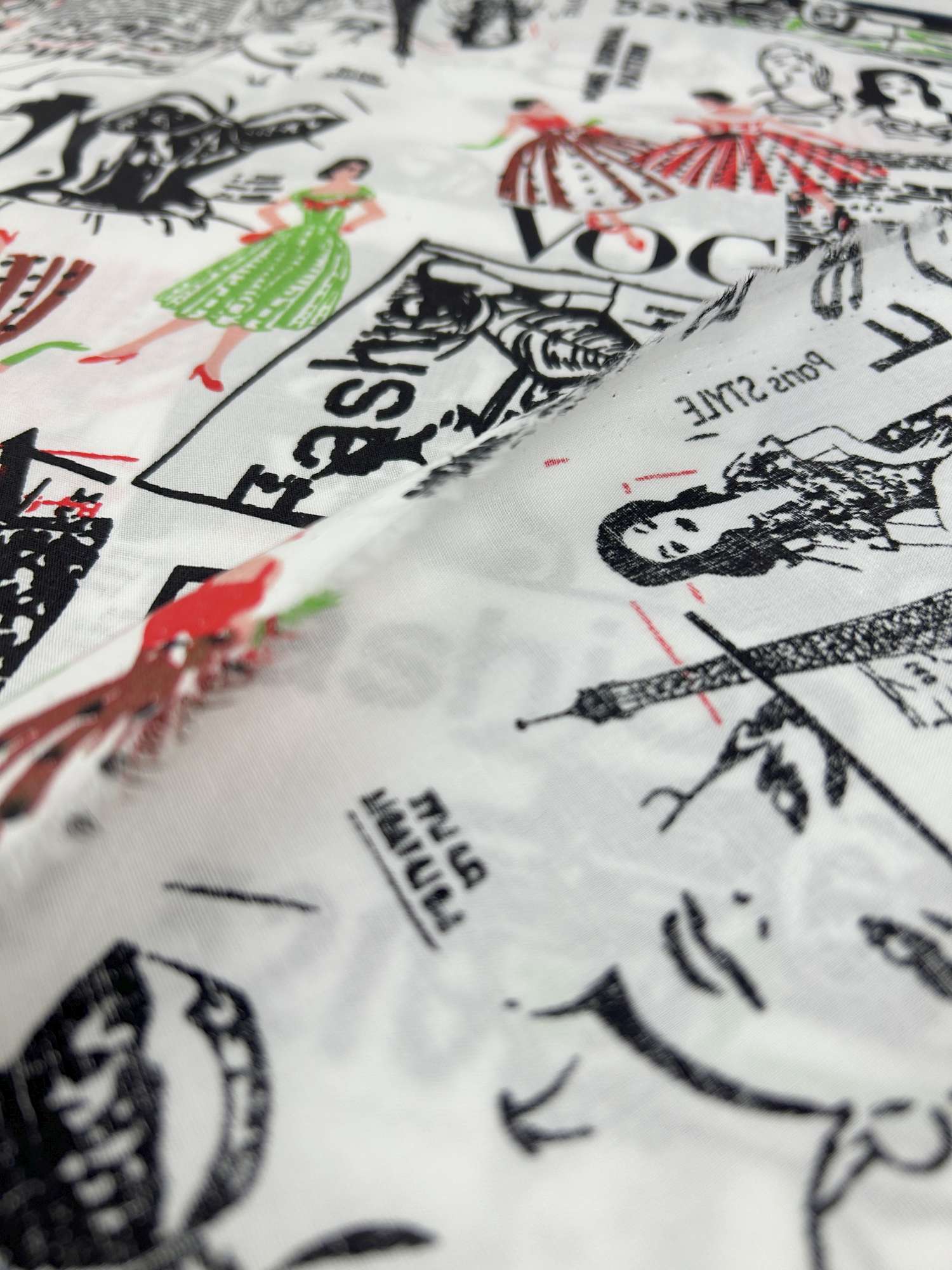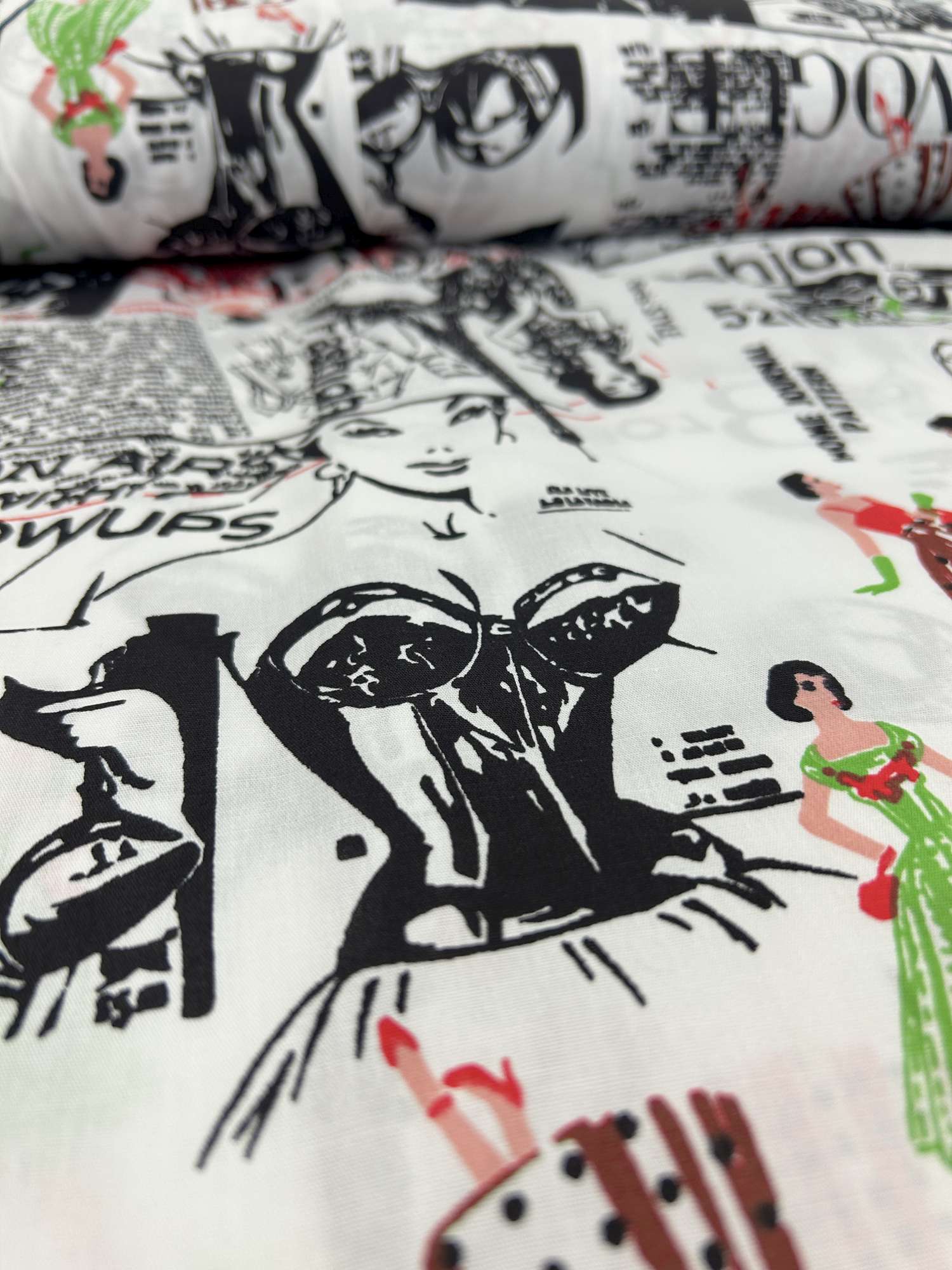 Dieser außergewöhnliche Baumwollstoff bringt echtes Fashion-Magazine-Feeling auf den Nähtisch. Der moderne Print kombiniert stilisierte Modeillustrationen, Schriftzüge, Retro-Elemente und grafische Fashion-Statements auf hellem Hintergrund. Dadurch wirkt der Stoff lebendig, kreativ und gleichzeitig tragbar – ideal für Kleidung mit Charakter.