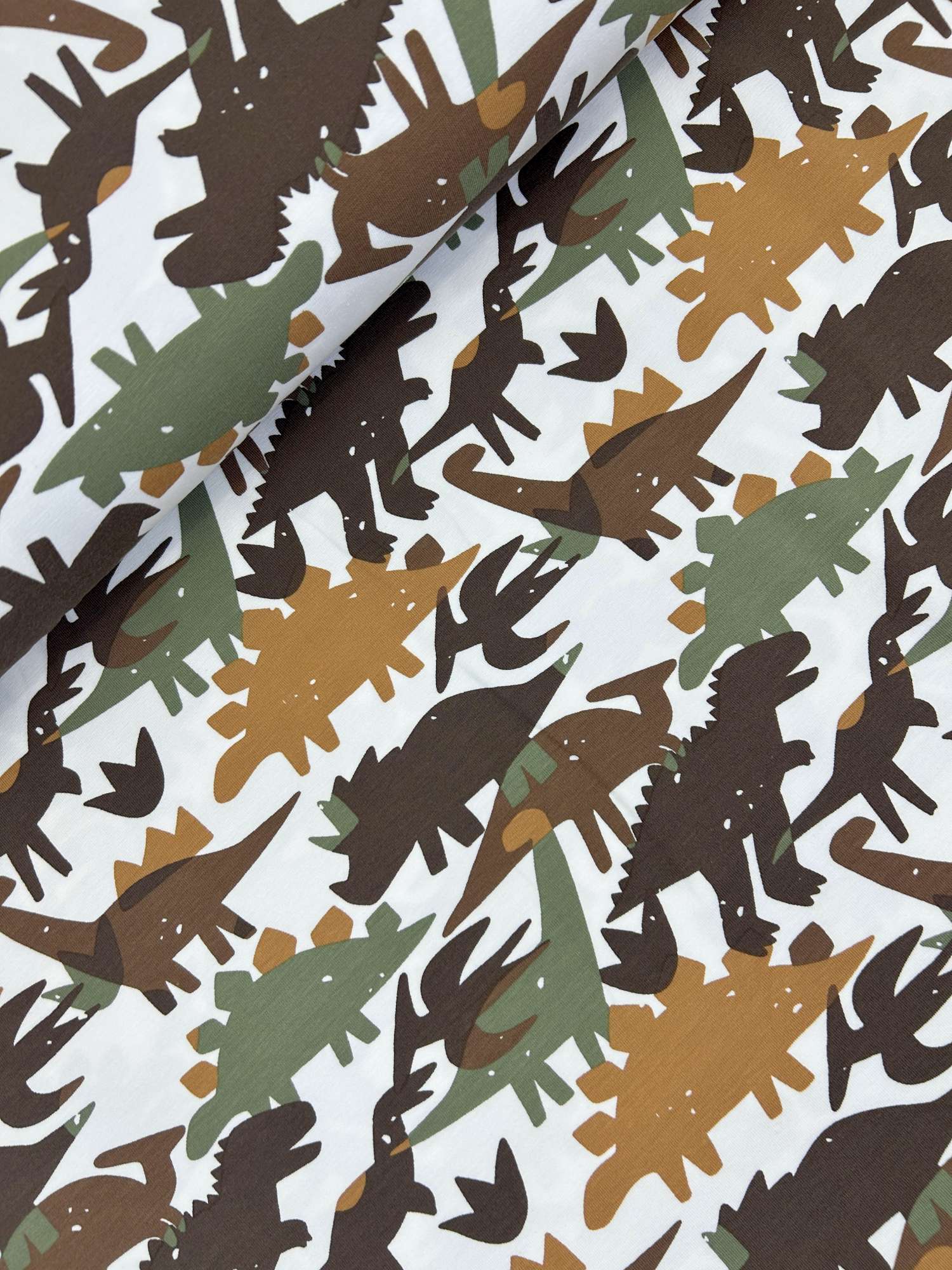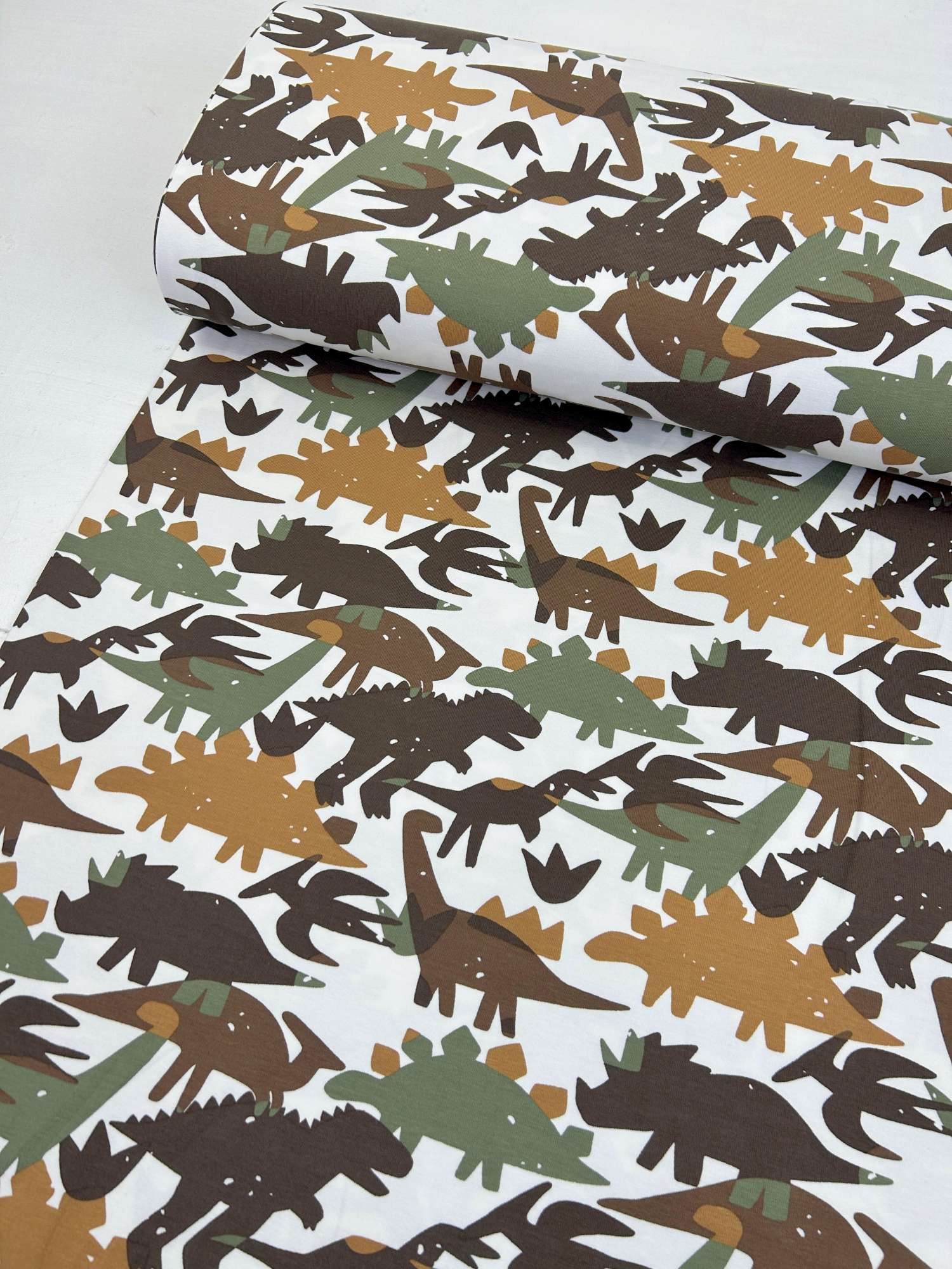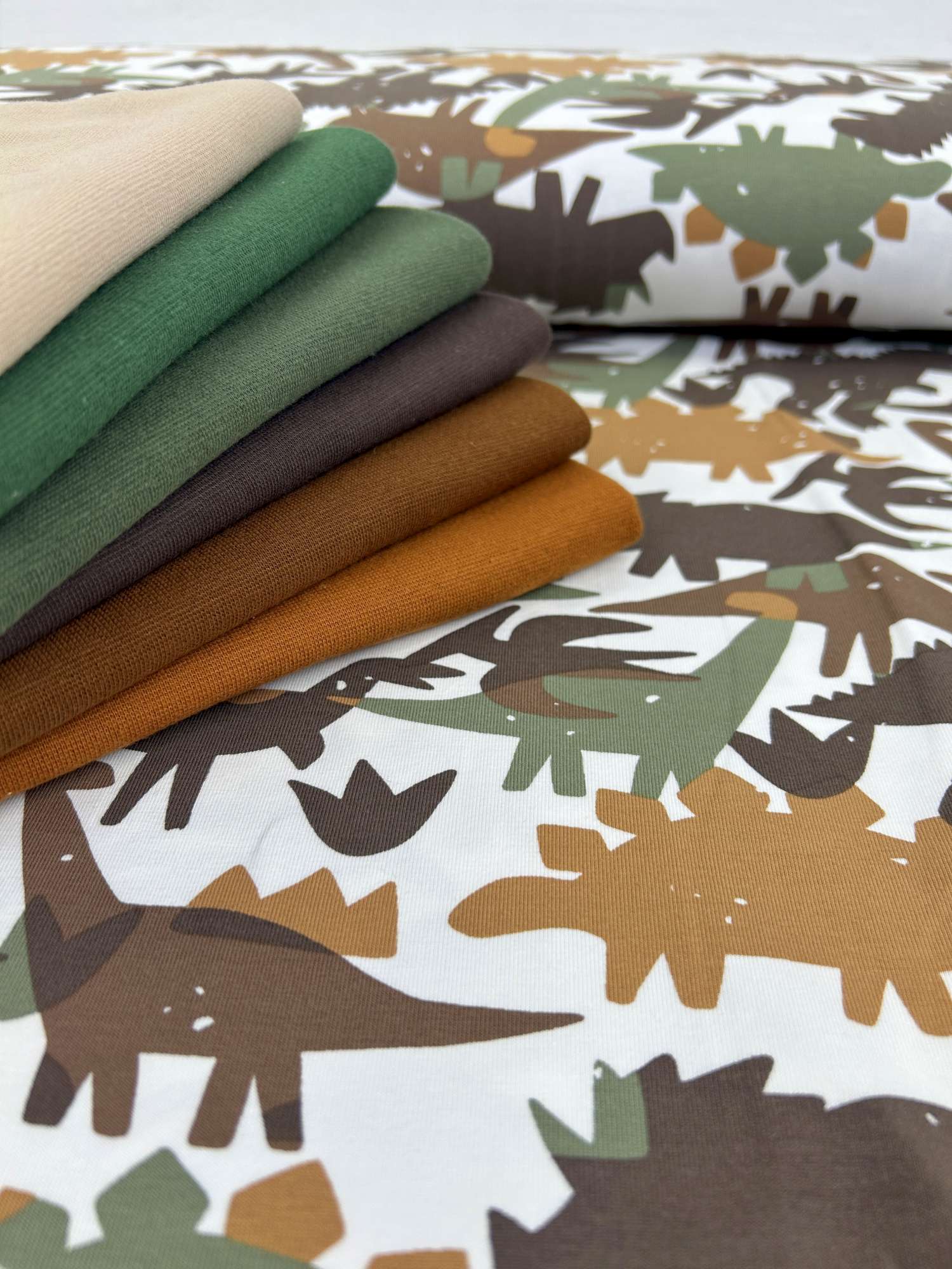 Dieser Baumwolljersey mit fröhlichem Dinosaurier-Motiv ist ein klassischer Allrounder für bequeme Kinderkleidung. Der Stoff besteht aus 95 % Baumwolle und 5 % Elasthan, ist angenehm weich, atmungsaktiv und leicht dehnbar. Mit einer Breite von ca. 145 cm und einem Gewicht von ca. 200 g/m² eignet er sich ideal für Shirts, Longsleeves, Pumphosen, Leggings, Schlafanzüge, Kleider oder leichte Hoodies. Das Motiv ist kindgerecht, zeitlos und perfekt für Alltag, Kindergarten und Freizeit. Durch den Elasthan-Anteil bleibt der Stoff formstabil und macht jede Bewegung mit. Der Baumwolljersey lässt sich gut zuschneiden, rollt sich nur leicht an den Kanten und ist auch für Nähanfänger gut geeignet. Für ein stimmiges Nähergebnis findest du bei uns farblich passendes Baumwolljersey sowie passende Bündchen als Kombistoffe.