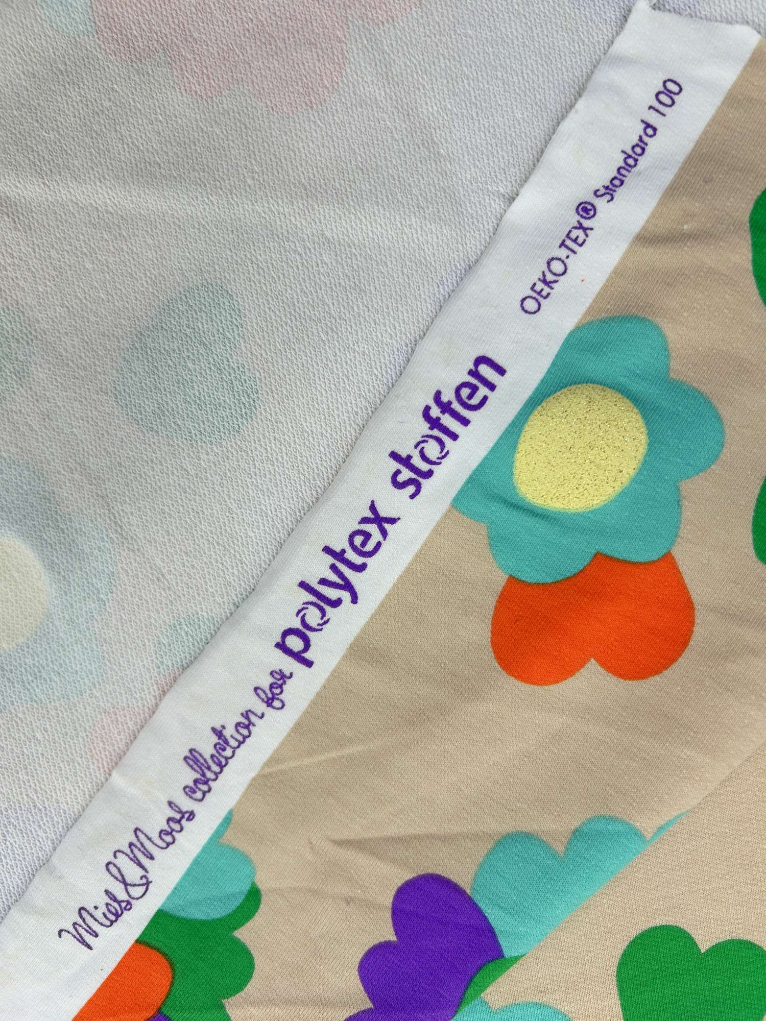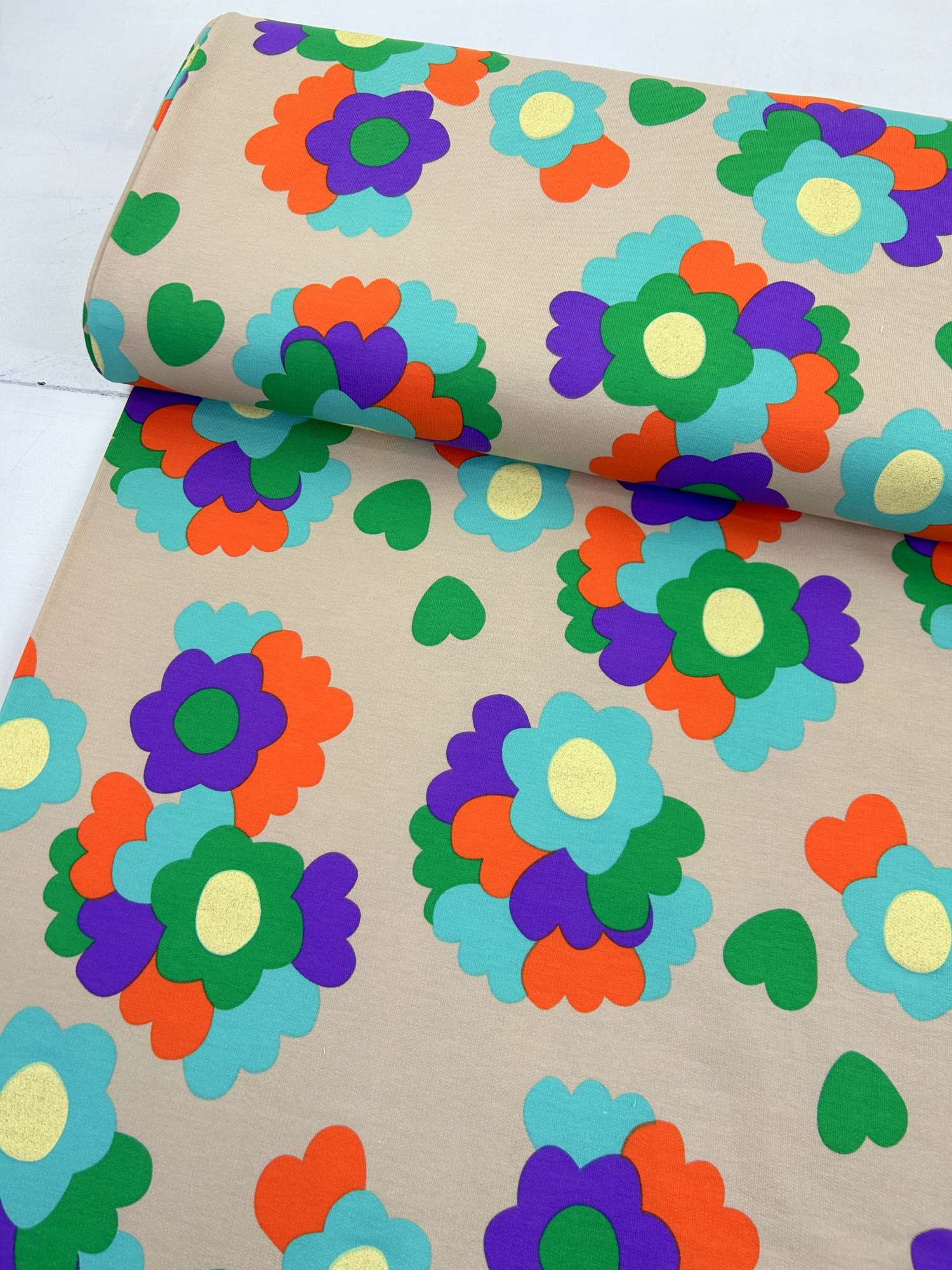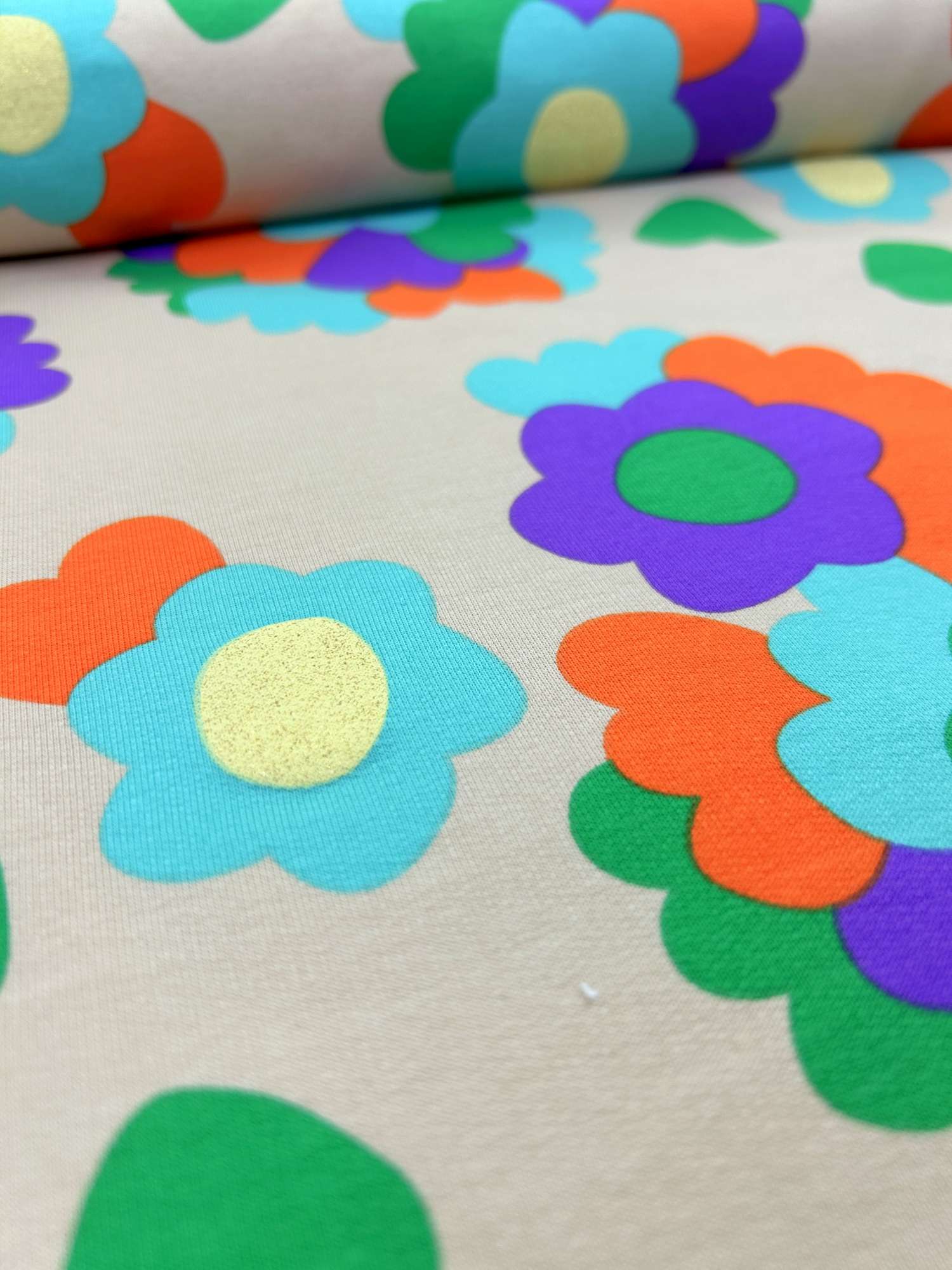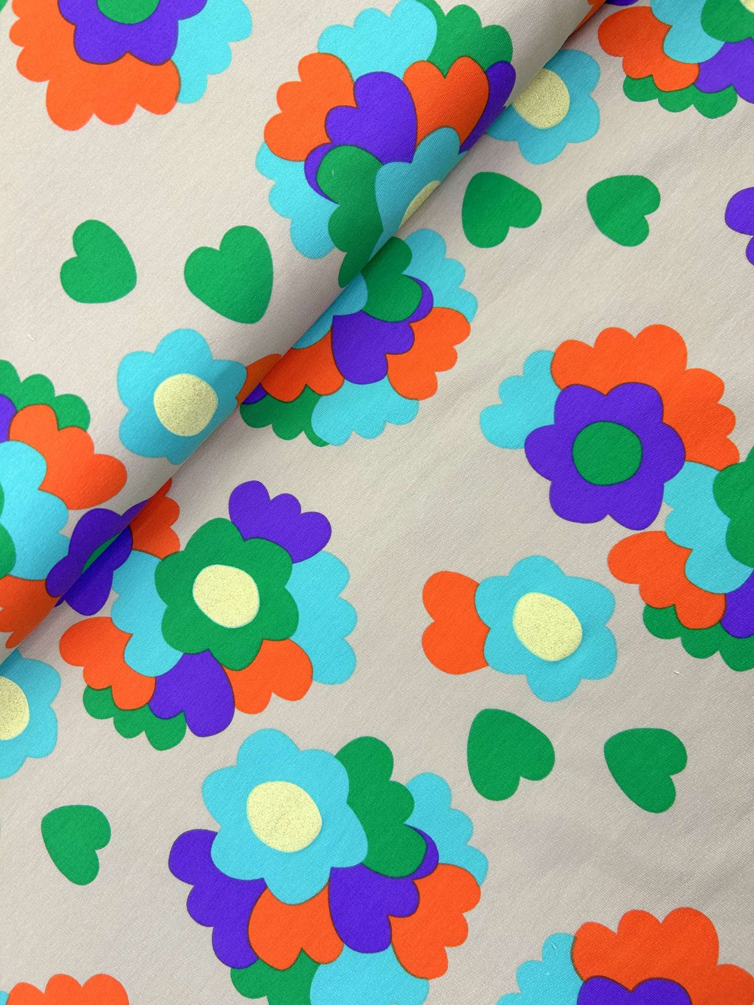 Ein weicher, angenehm griffiger French Terry mit knalligem Retro-Blumenmuster und glitzernden goldenen Blütenmitten – genau das Richtige, wenn du ein Statement-Projekt nähen willst. Der Stoff hat einen komfortablen Stretchanteil, fällt locker und ist für Kinder wie Erwachsene gleichermaßen geeignet. Die glitzernde Mitte der Blüten ist tatsächlich gold glitzernd, nicht nur optisch gelb – dadurch wirkt der Print hochwertiger und lebendiger.