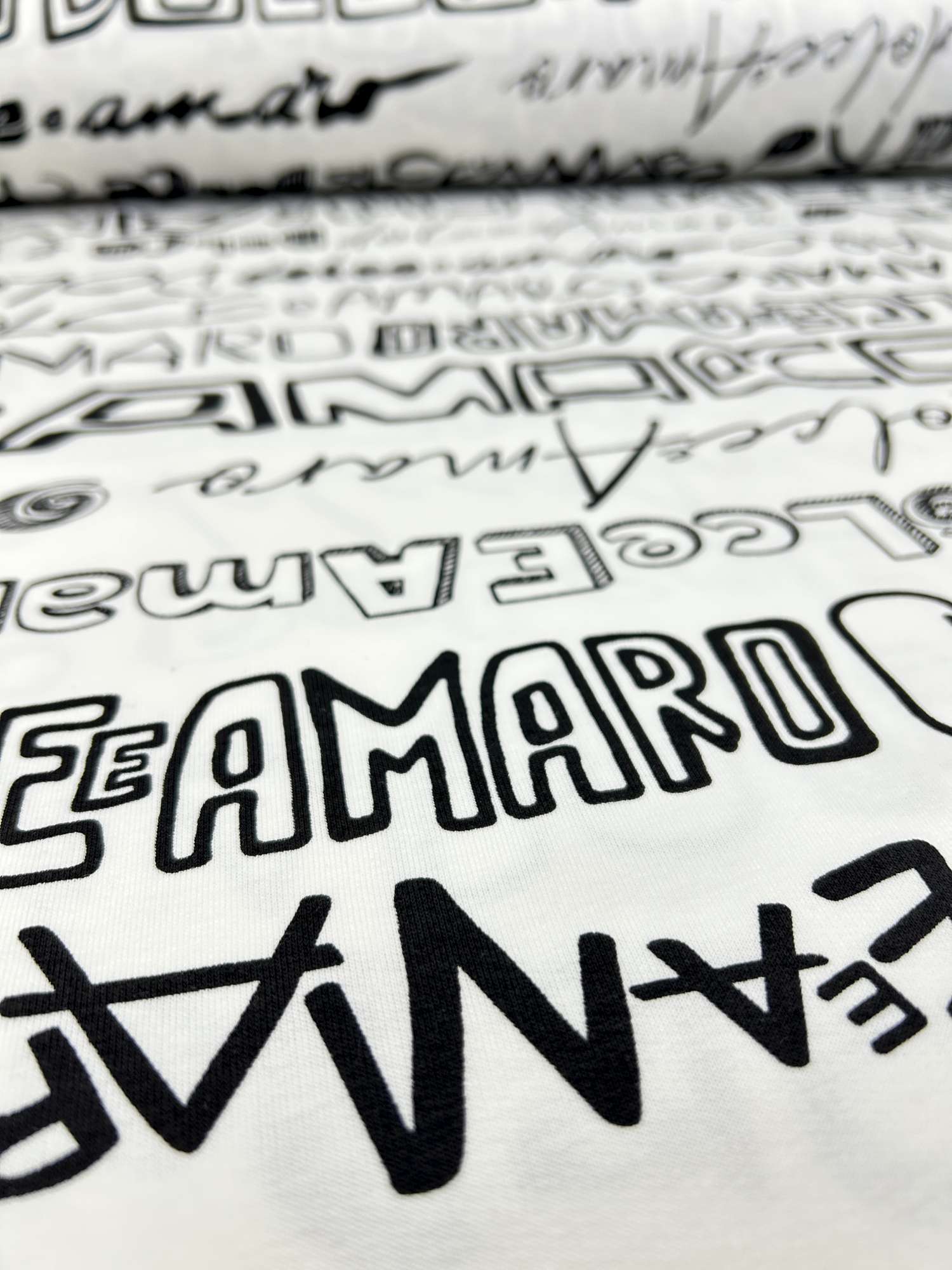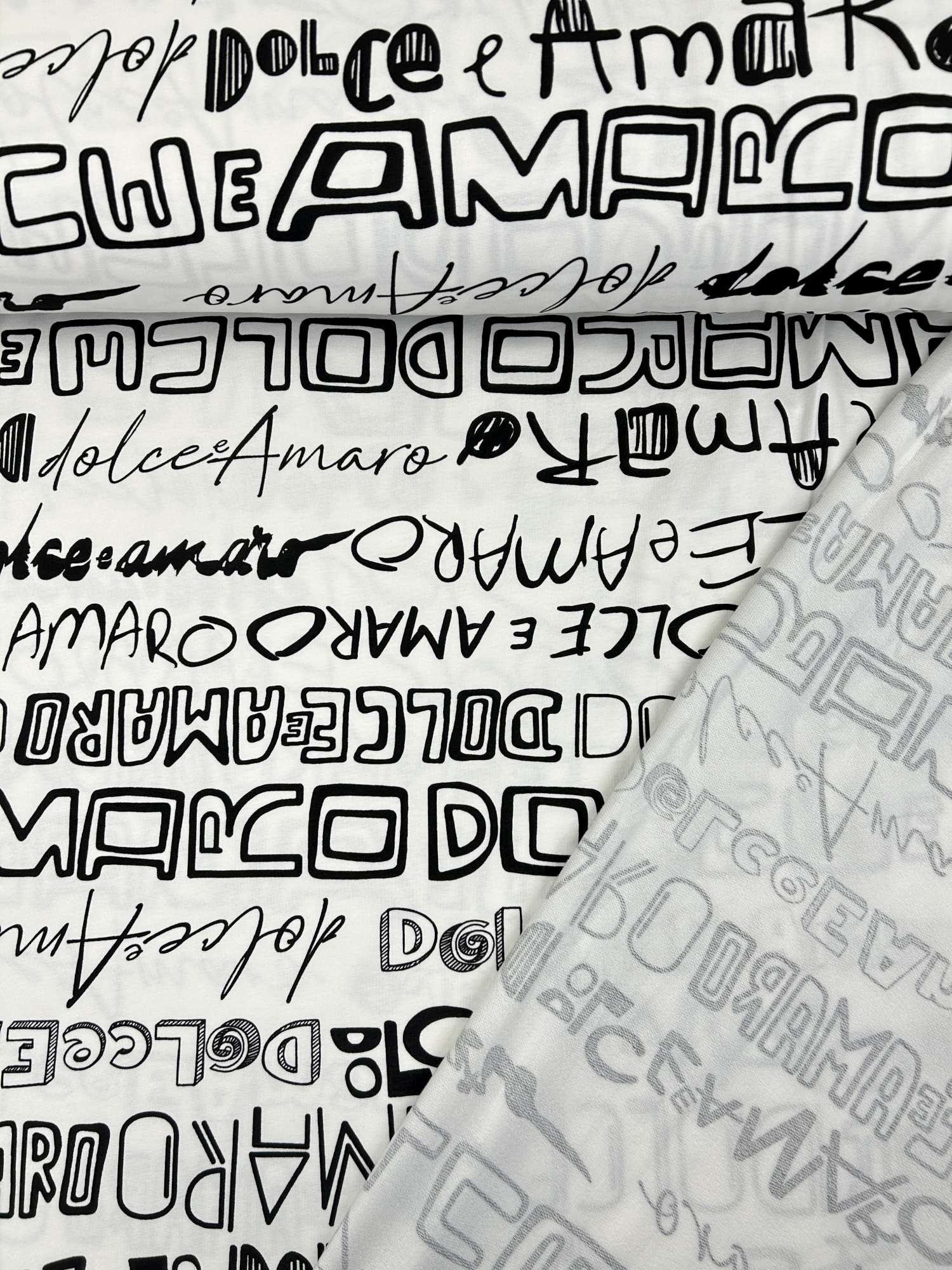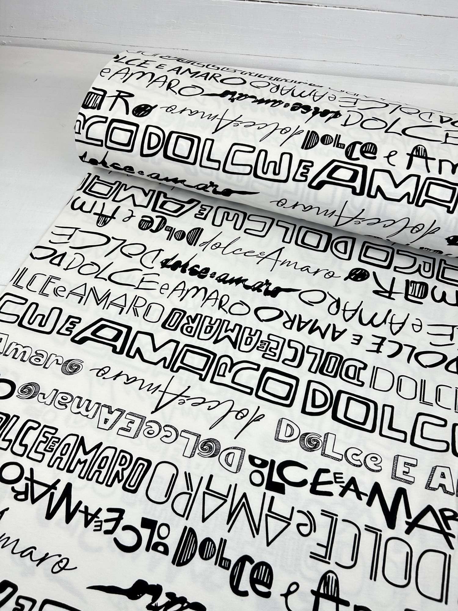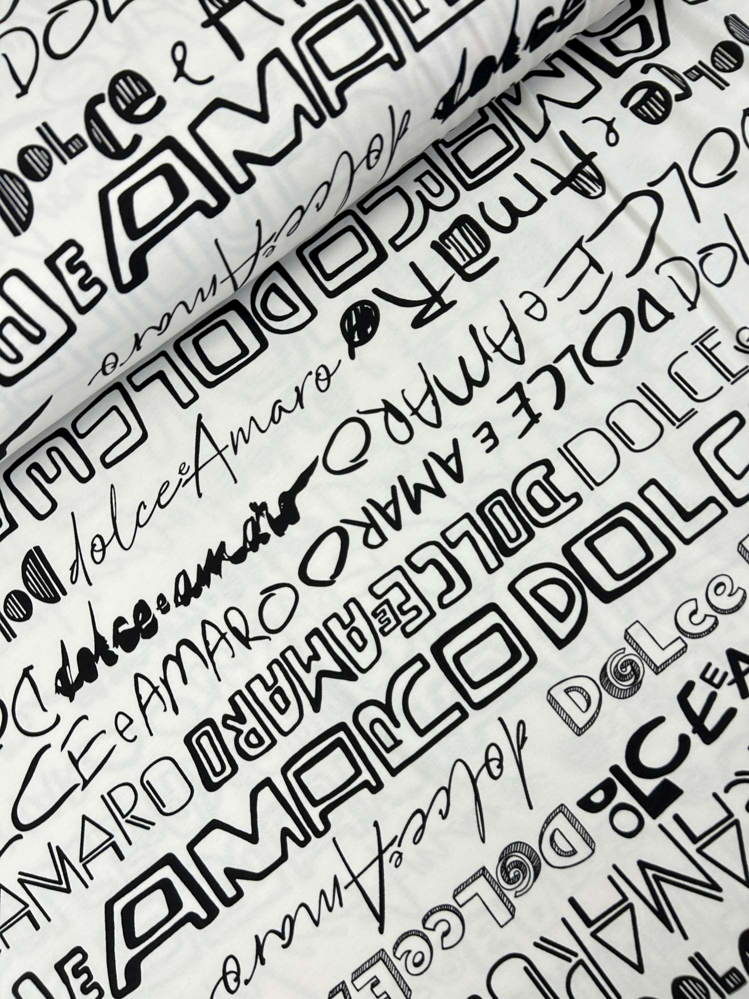 Dieser hochwertige French Terry mit Schrift-Design „Dolce & Amaro“ ist ein echter Hingucker für alle, die klare Kontraste und moderne Typografie lieben. Das Design zeigt unterschiedliche Schriftzüge und Schriftarten in Schwarz auf weißem Hintergrund – mal bold, mal verspielt, mal grafisch. Urban, clean und absolut trendstark.